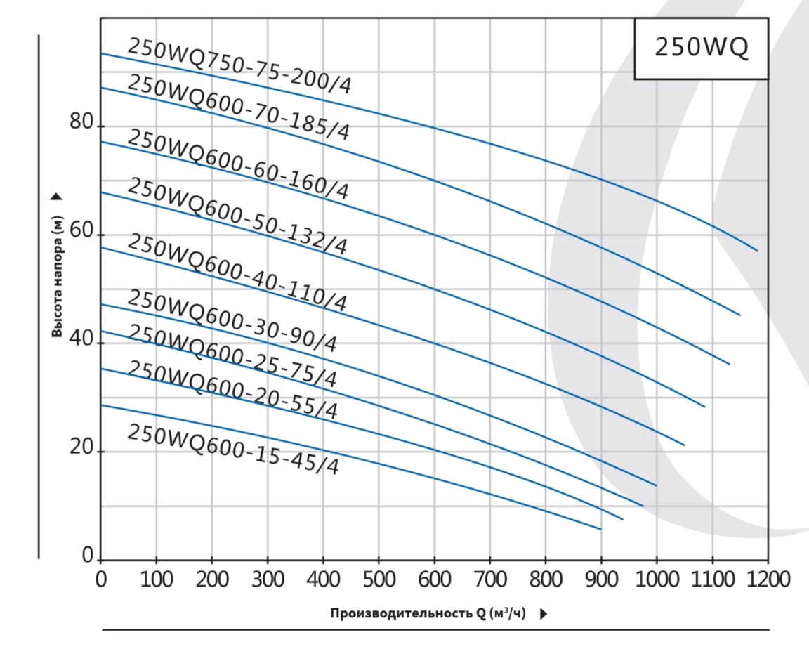 Мощность насоса Purity 250WQ600-30-90/4 составляет 90 кВт, а напряжение - 380В. Насос обеспечивает высоту напора 30 м, производительность 600 м³/ч.