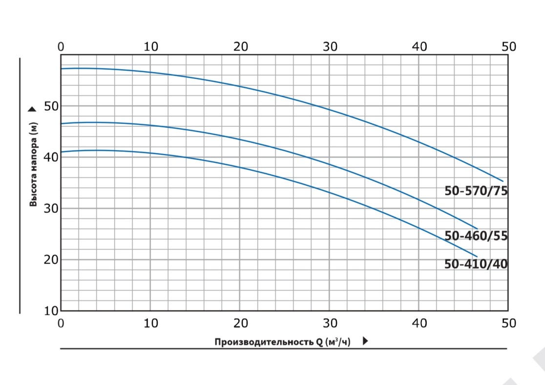 Мощность насоса Purity PT 50-460/55 (N) составляет 5.5 кВт, а напряжение - 380В. Насос обеспечивает напор от 30 до 43.8 м, производительность — от 18 до 42 м³/ч.