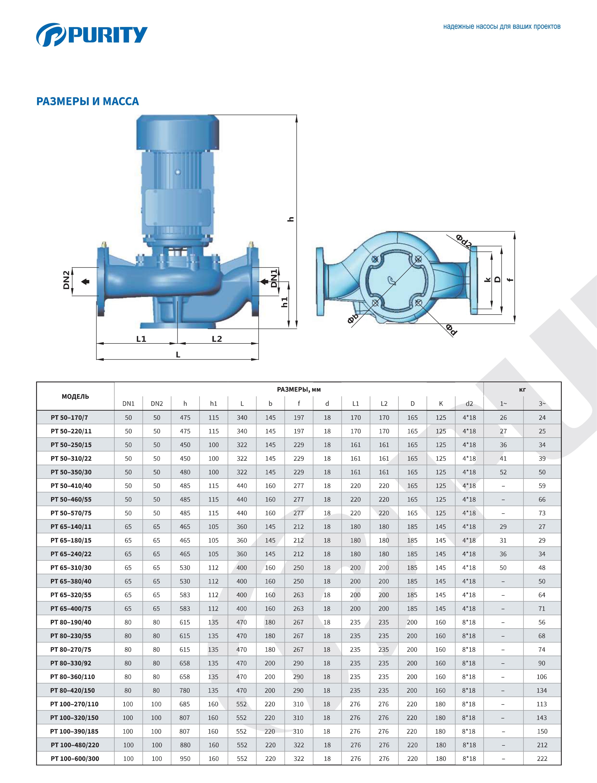 Мощность насоса Purity PTm 65-240/22 (N) составляет 2.2 кВт, а напряжение - 220В. Насос обеспечивает напор от 8.3 до 23.2 м, производительность — от 18 до 48 м³/ч.