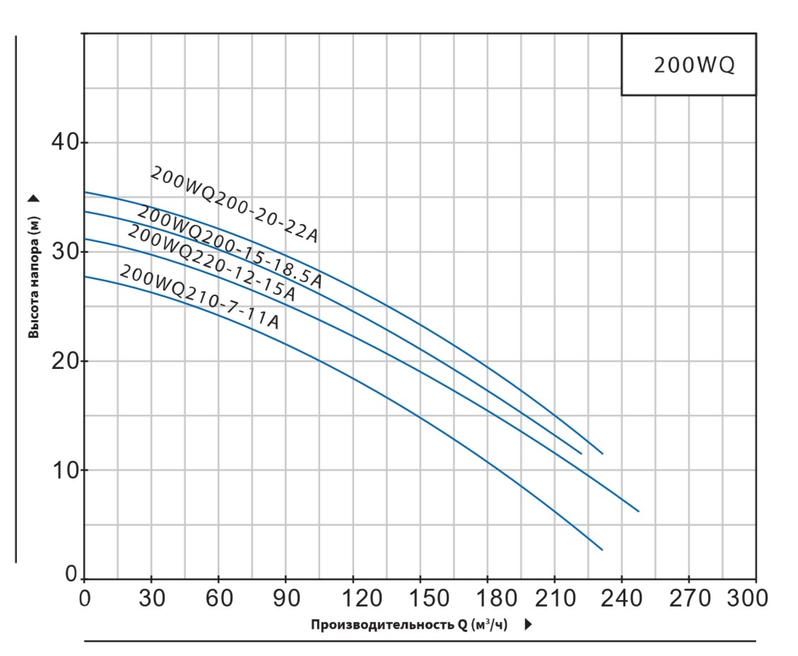 Мощность насоса Purity 200WQ200-20-22A составляет 22 кВт, а напряжение - 380В. Насос обеспечивает высоту напора 20 м, производительность 200 м³/ч.